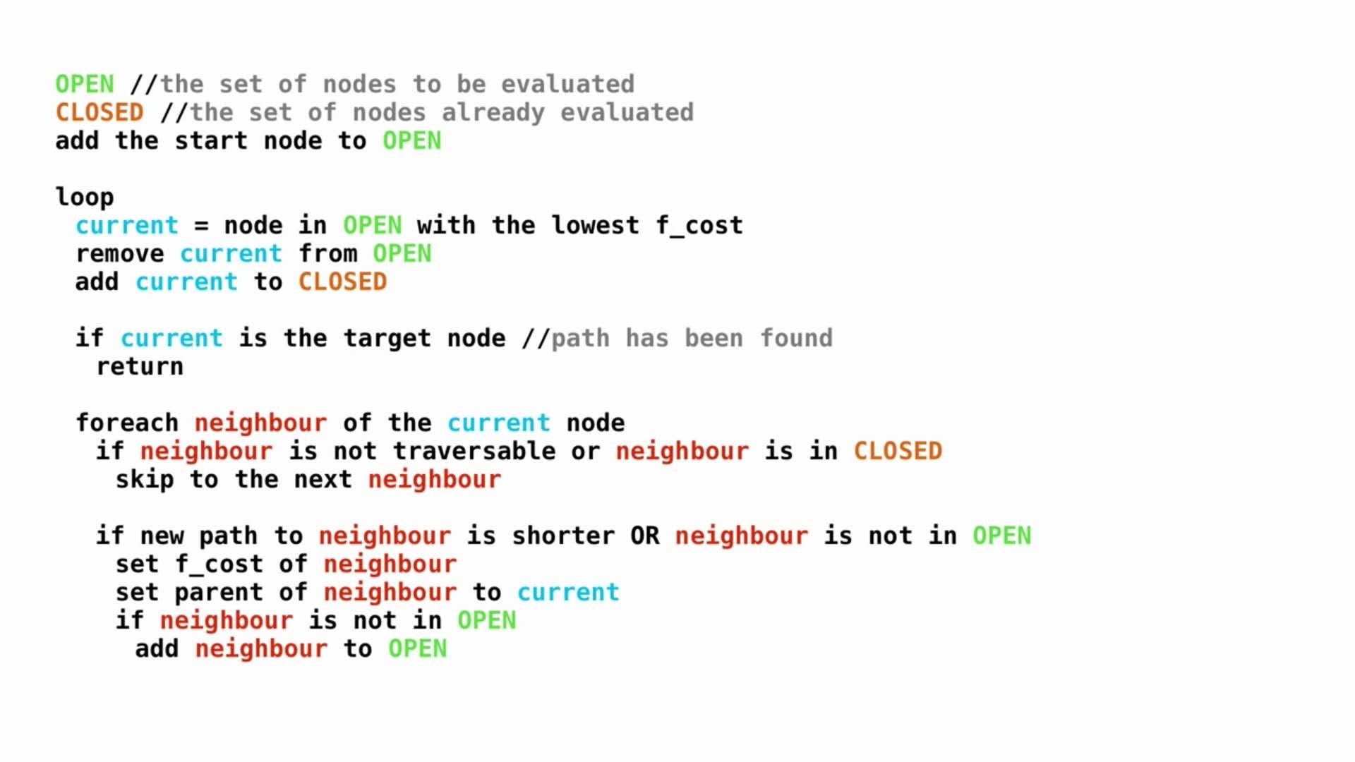 a. 遍历open list ,查找F值最小的节点,把它作为当前要处理的节点,然后移到close list中.